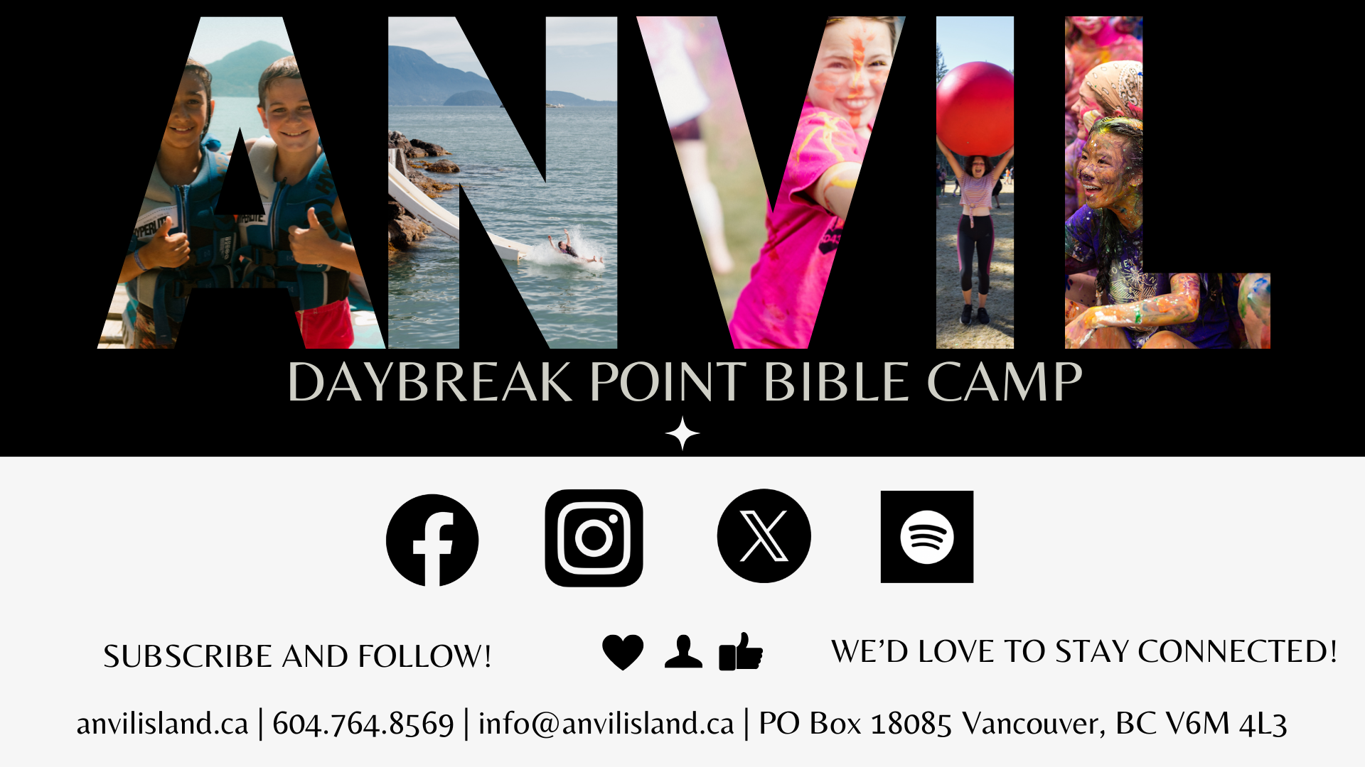 Want to get all the latest info on all things related to Daybreak Point Bible Camp, Anvil Island and our extended ministry? Join our mailing list and get access to our E-newsletter, which will included updates on projects, fundraising, and any other new and exciting news!